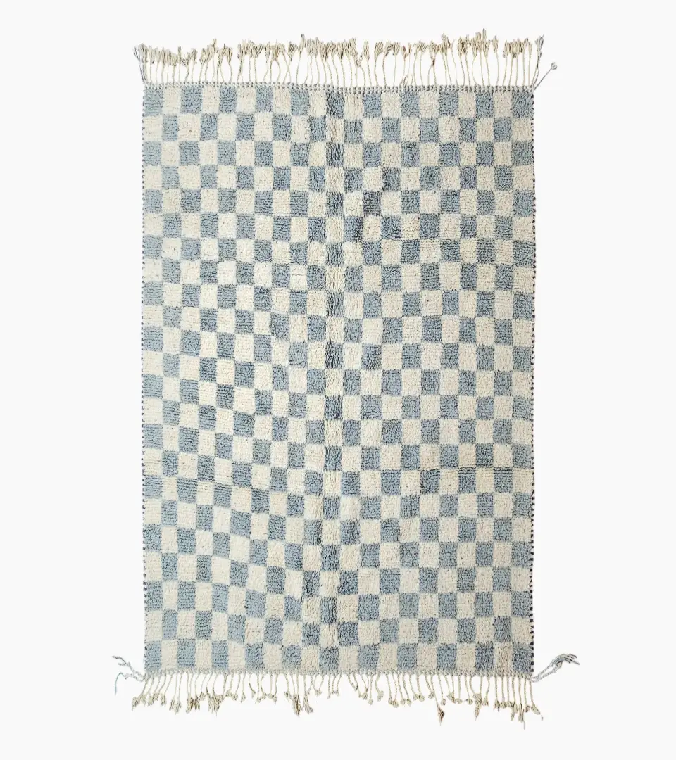 Introduce a serene, modern aesthetic with the Aura, a hand-knotted Beni Ourain rug. Hand-crafted in Morocco, this plush checkered wool rug features a clean and minimalist checkerboard design. The pattern is created with soft squares of a light, dusty blue and creamy ivory, offering a subtle yet graphic visual. The high pile adds a layer of luxurious comfort and rich texture.