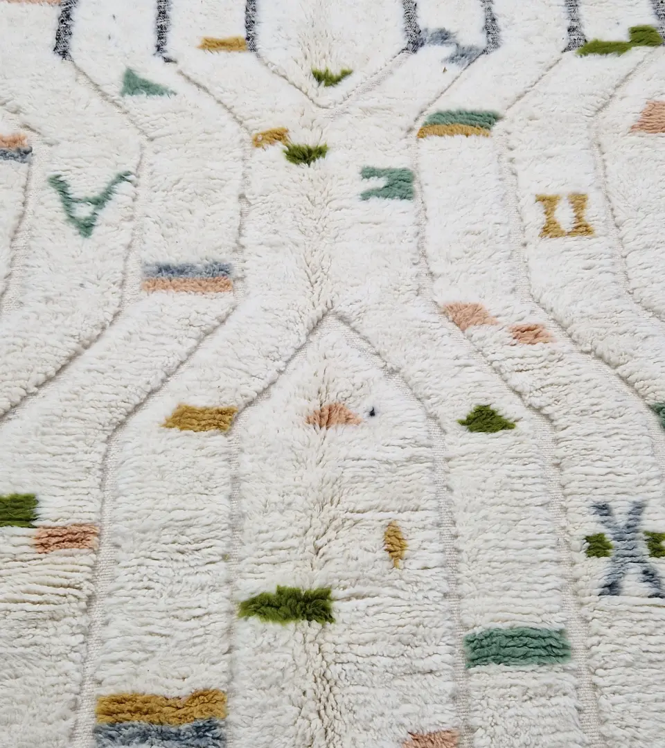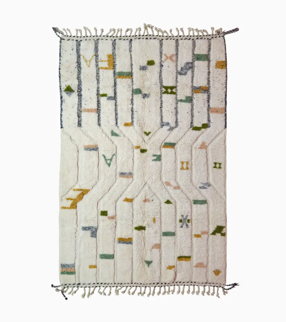 Infuse your space with personality and warmth with this unique handmade striped wool rug. Hand-knotted by artisans in the High Atlas Mountains of Morocco, this piece features a striking abstract, striped pattern on a soft, creamy base. The playful pops of green, yellow, and blue are highlighted by a varied high-and-low pile texture, creating a truly unique and artistic design. This rug showcases the rich, free-spirited artistry of the Azilal tribe.
