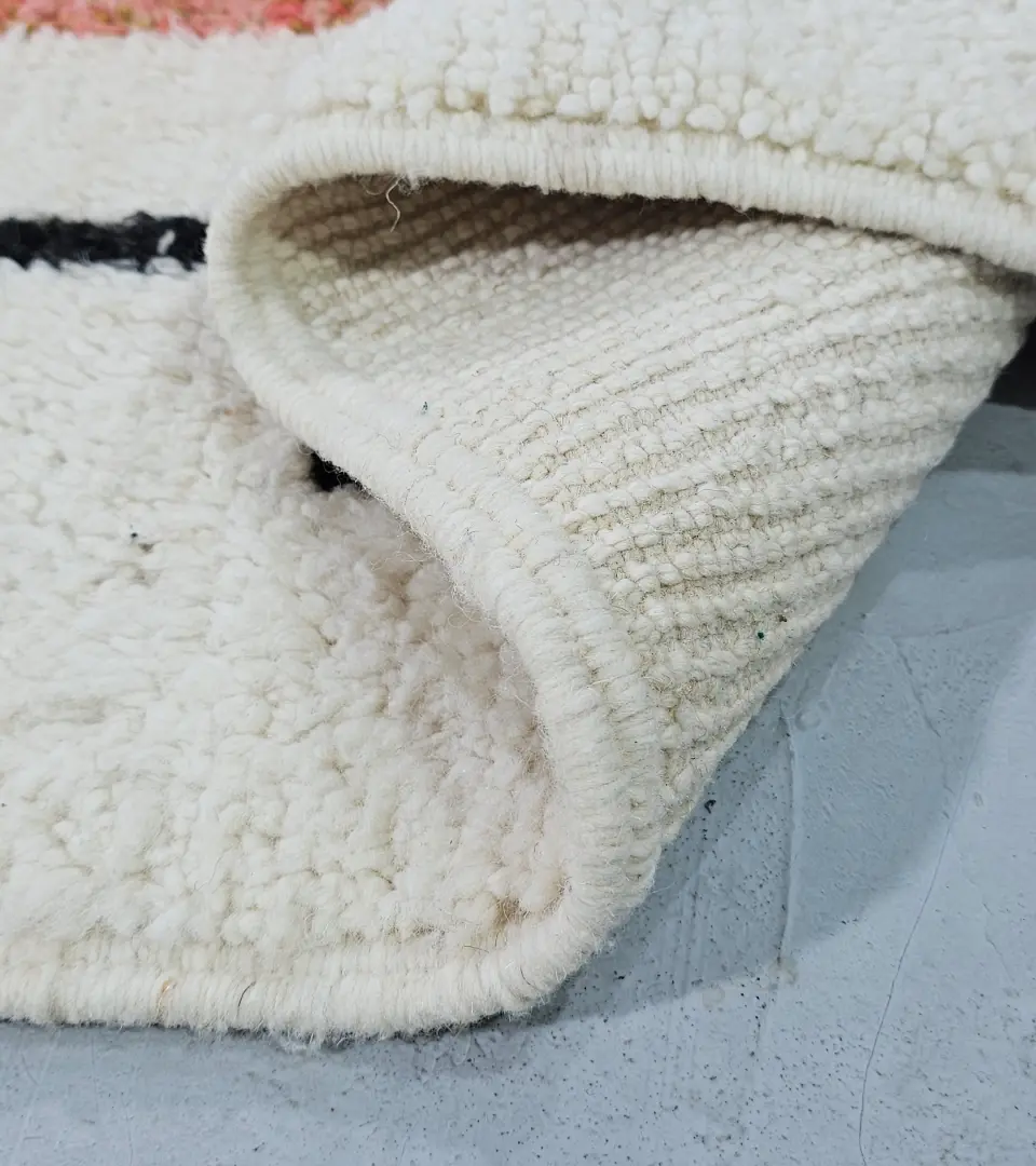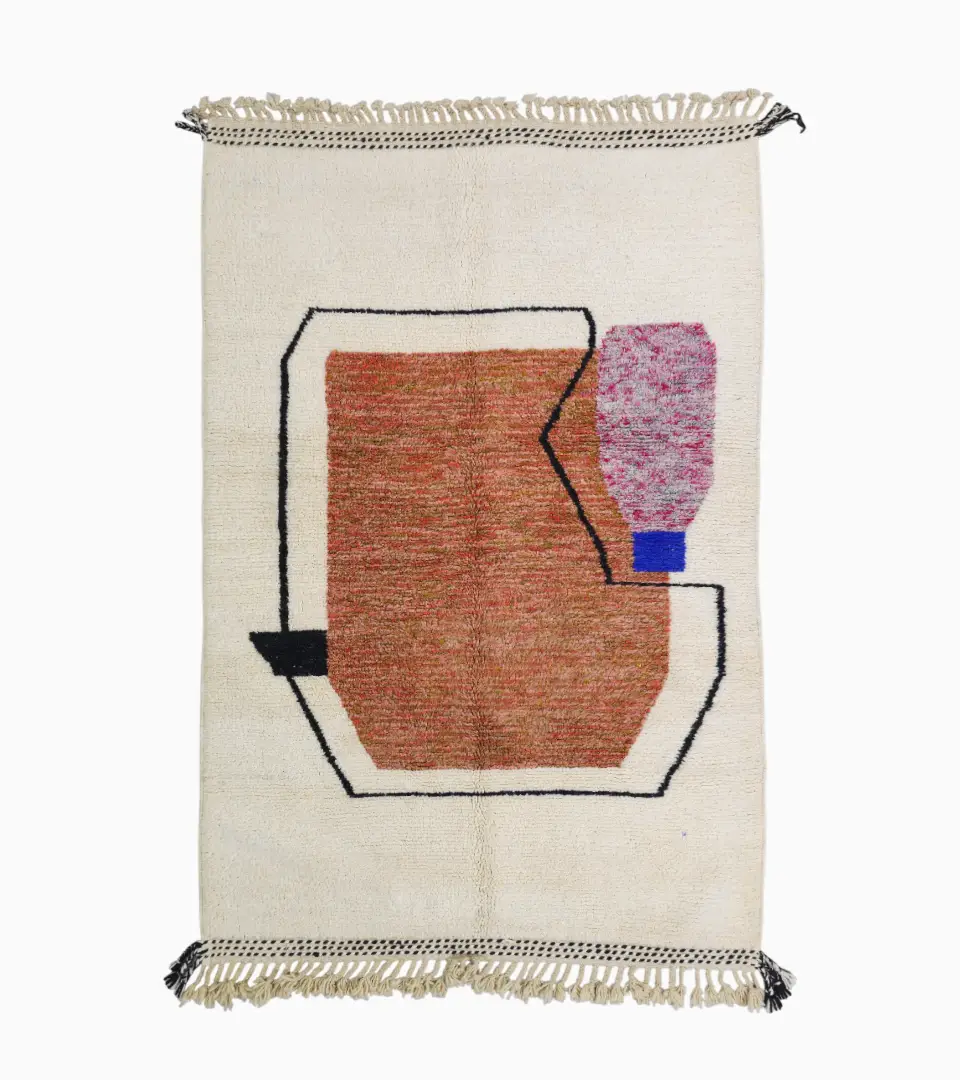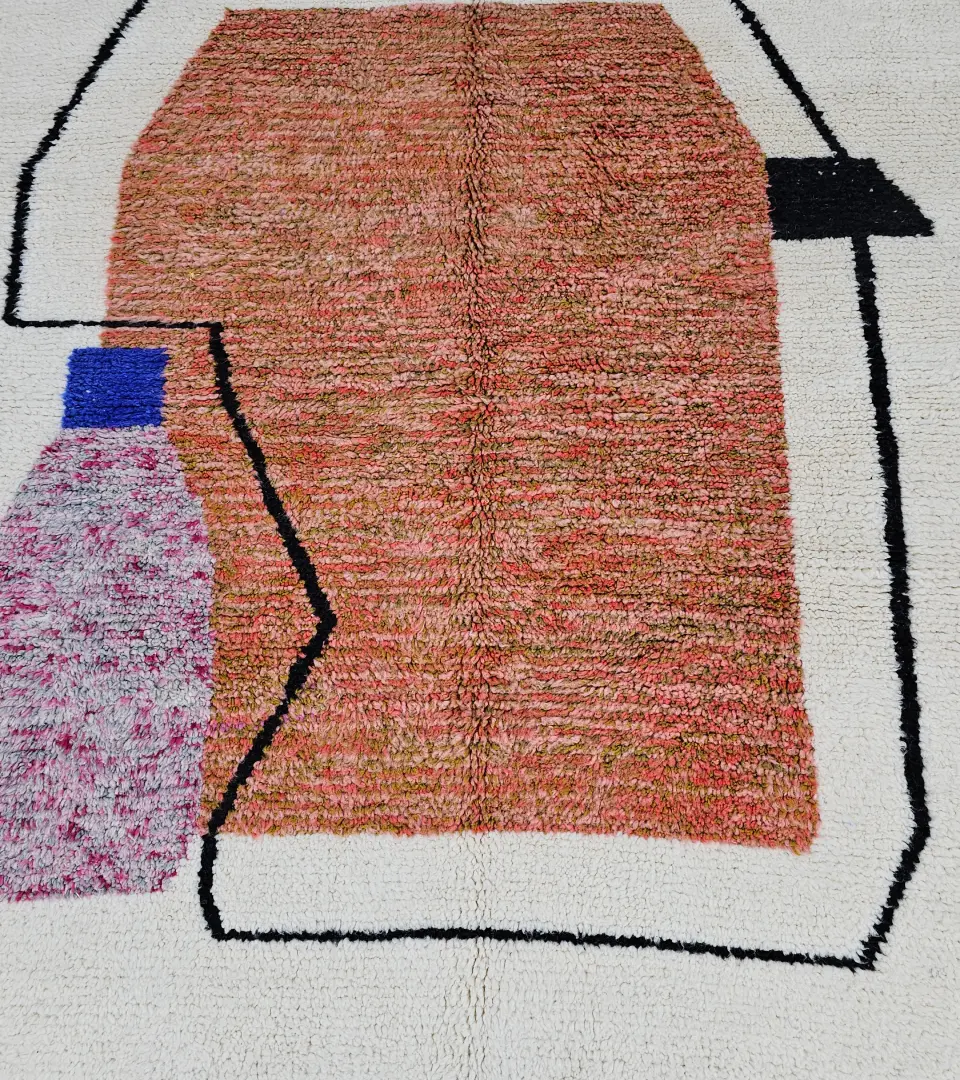 Discover the comfort and unique design of the Fairouz rug, a soft, hand-knotted masterpiece of modern Moroccan artistry. Woven by skilled artisans in the High Atlas Mountains, this exceptionally soft wool rug features a bold, abstract geometric shape in a warm terracotta color, outlined in a striking black line. A playful touch of pink and blue complements the modern design, all set against a classic ivory background.