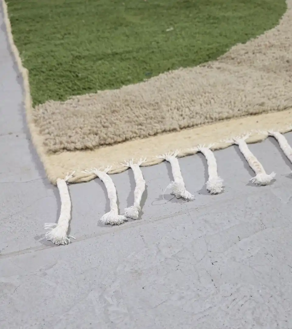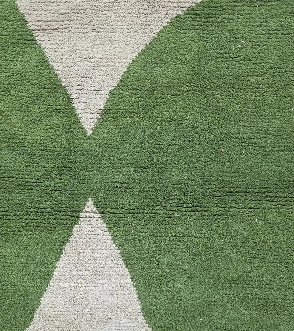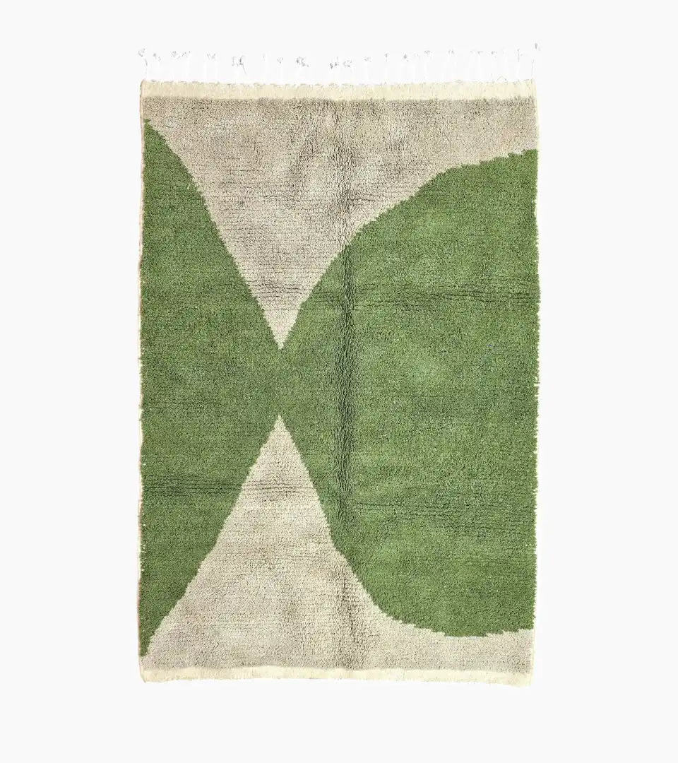Crafted in Morocco using traditional hand knotting techniques, this 100% wool rug offers a refined balance of texture and form. Its soft beige base contrasts gently with muted green geometric shapes, creating a calm yet sculptural presence.
