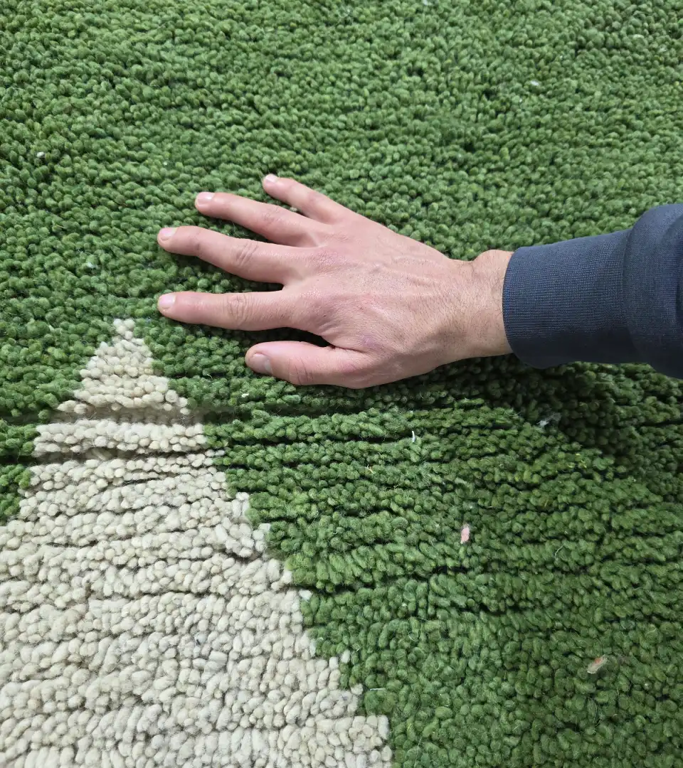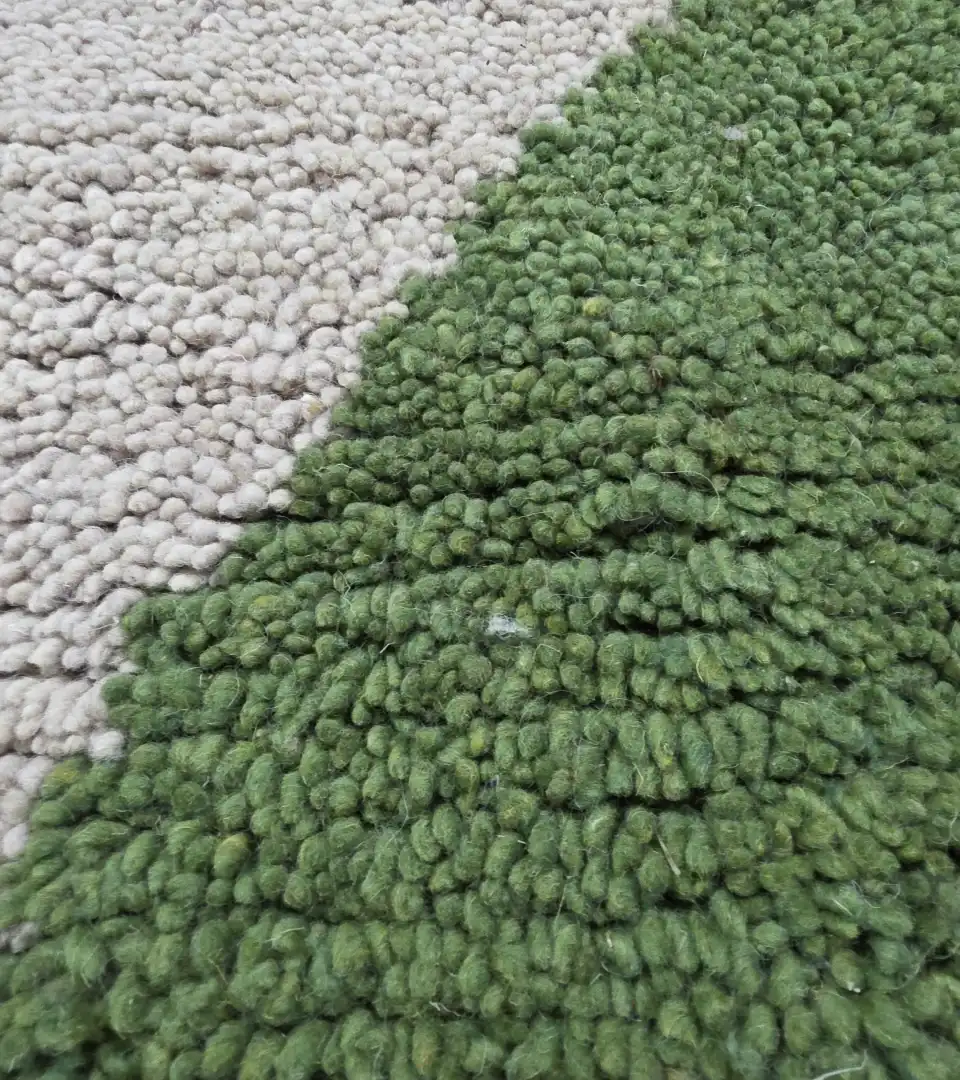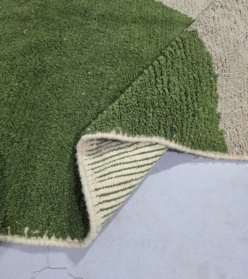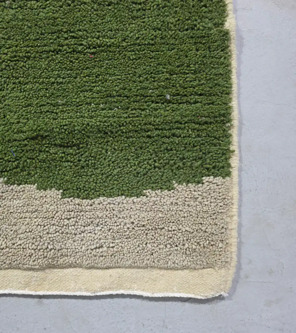 Crafted in Morocco using traditional hand knotting techniques, this 100% wool rug offers a refined balance of texture and form. Its soft beige base contrasts gently with muted green geometric shapes, creating a calm yet sculptural presence.