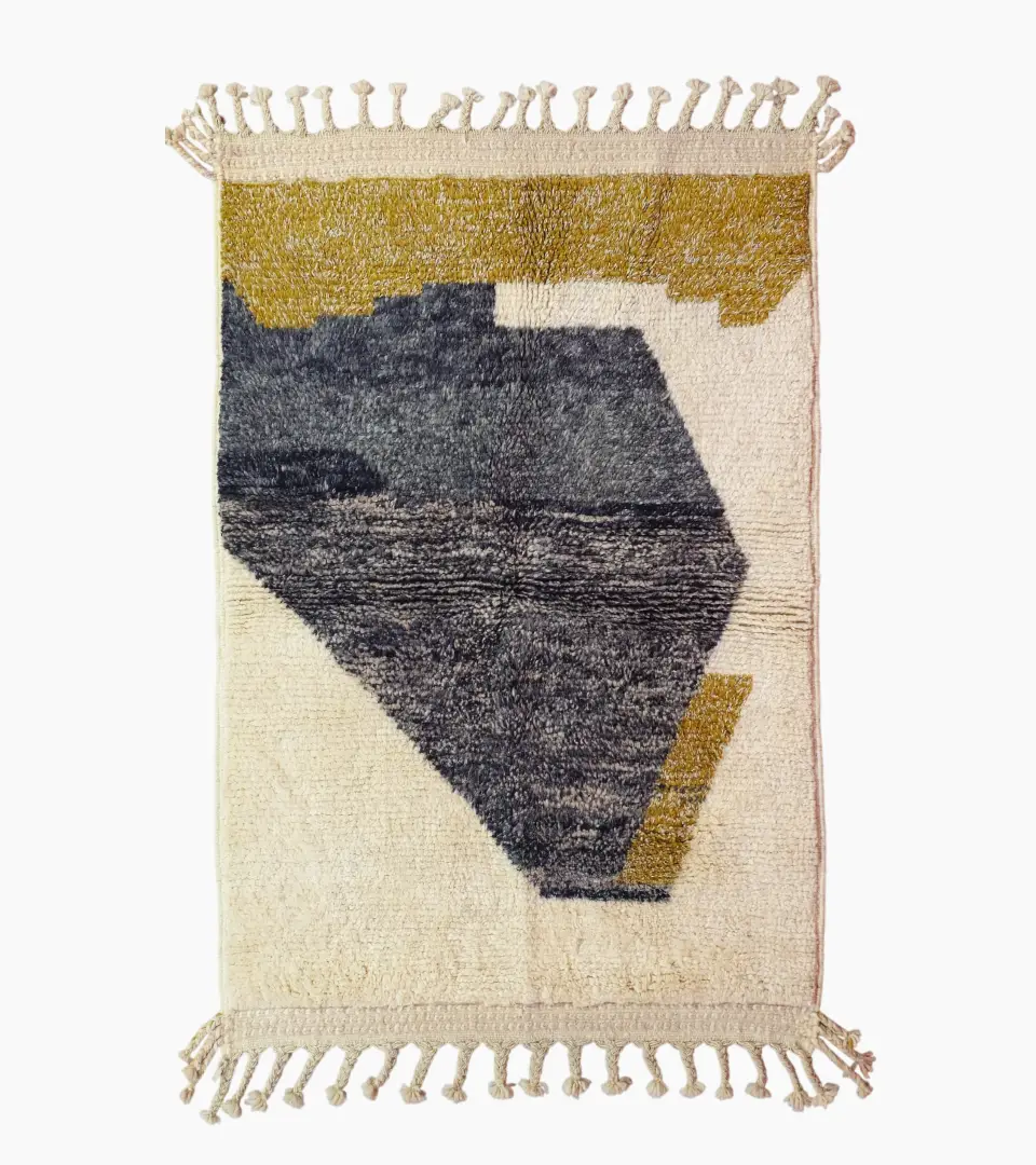 Introduce a touch of sophisticated art with the Imani, a hand-knotted Beni Ourain abstract geometric rug. Hand-crafted in Morocco, this plush rug features a captivating abstract geometric design. A bold, large shape in charcoal gray is complemented by a textured block in a muted mustard yellow and a smaller accent hexagon in the same hue, all set against a creamy ivory background. The high pile provides a luxurious, plush feel underfoot, making it a statement piece for any room.