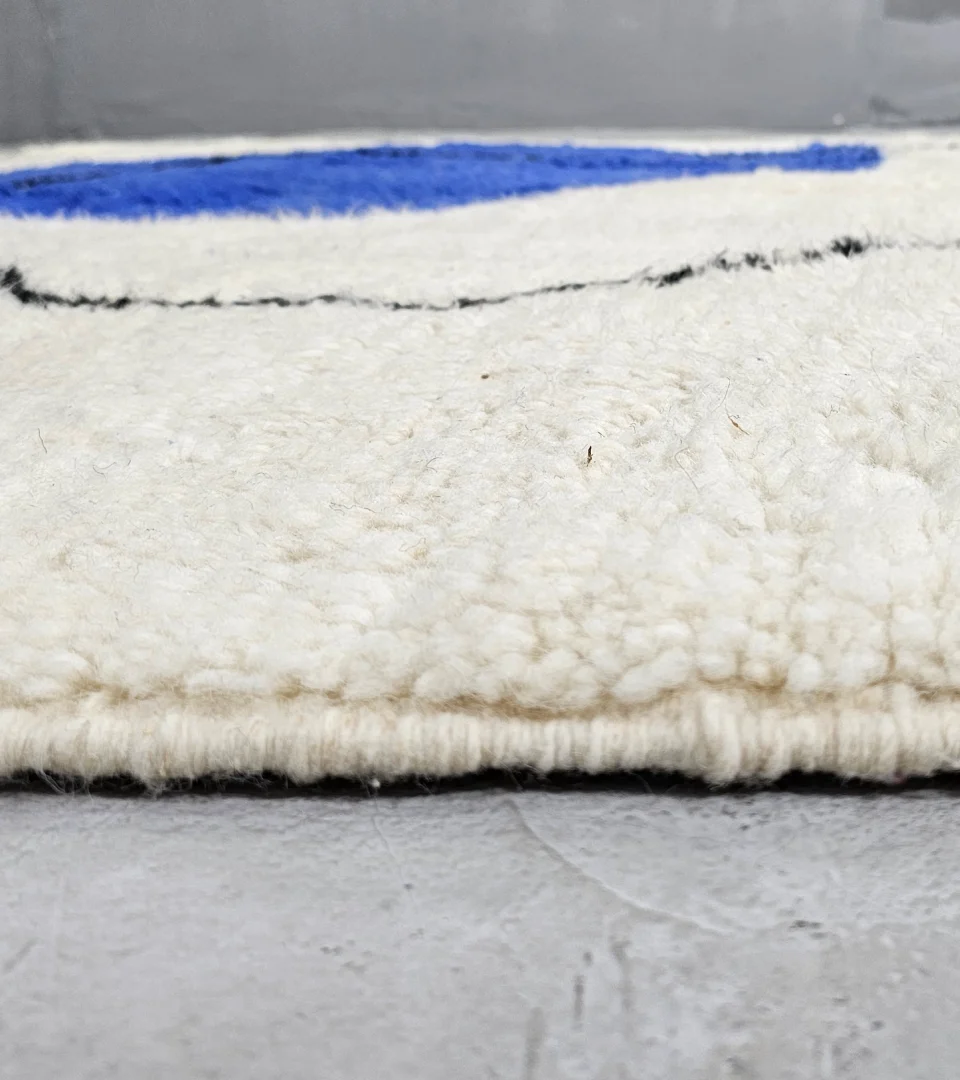 Hand knotted in Morocco, this high-pile wool abstract rug features two striking shapes in royal blue and mustard yellow, outlined by thick, expressive black lines. The asymmetrical composition evokes modern art with a hand-drawn, organic feel, while the soft cream background keeps the piece grounded and versatile.