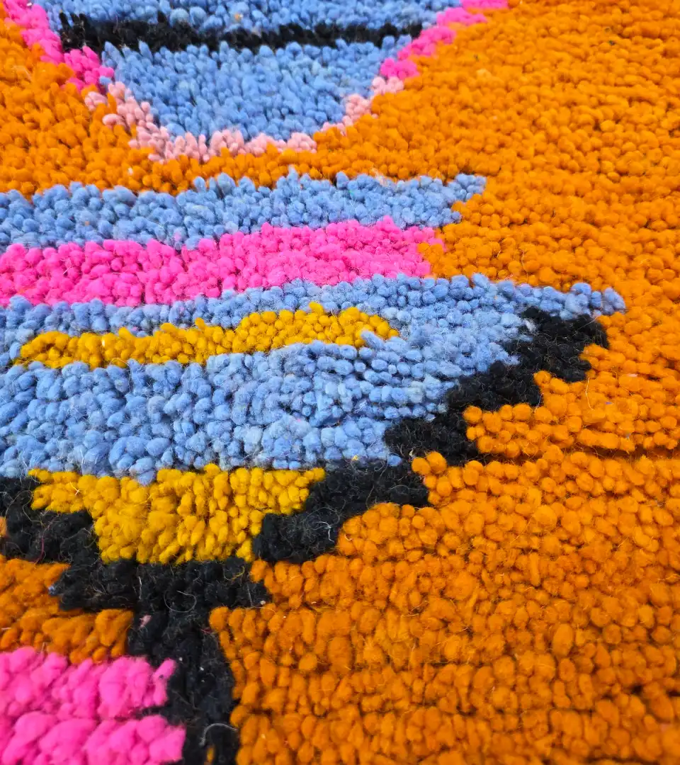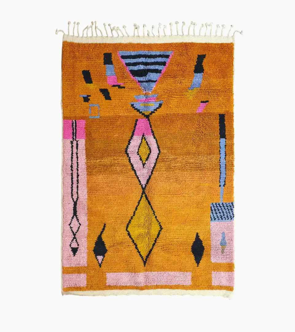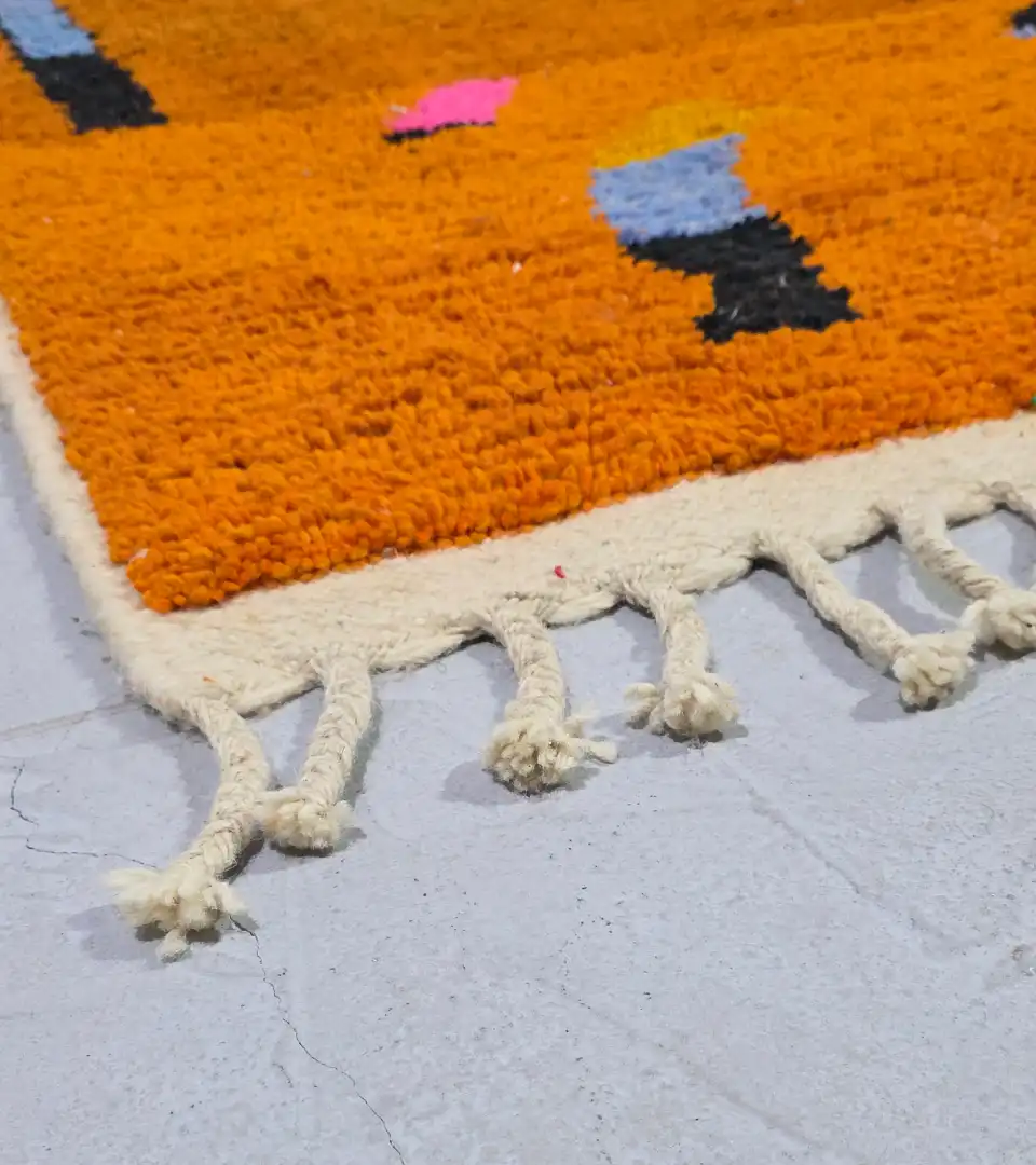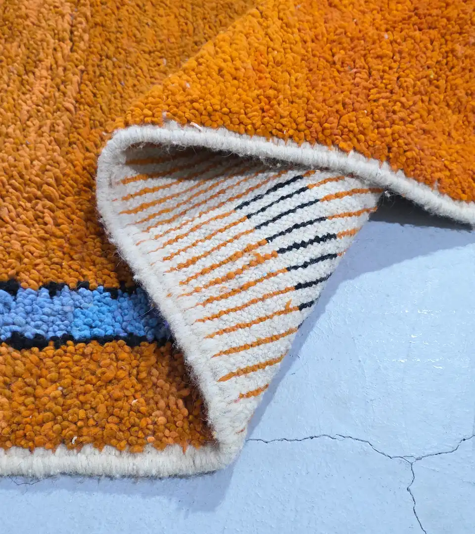 Crafted in Morocco using traditional hand knotting techniques, this 100% wool rug combines vibrant color with structured geometric design. Its warm orange base creates an inviting foundation while layered motifs introduce rhythm and visual contrast.