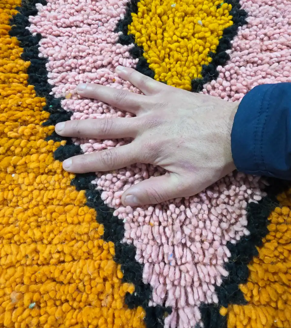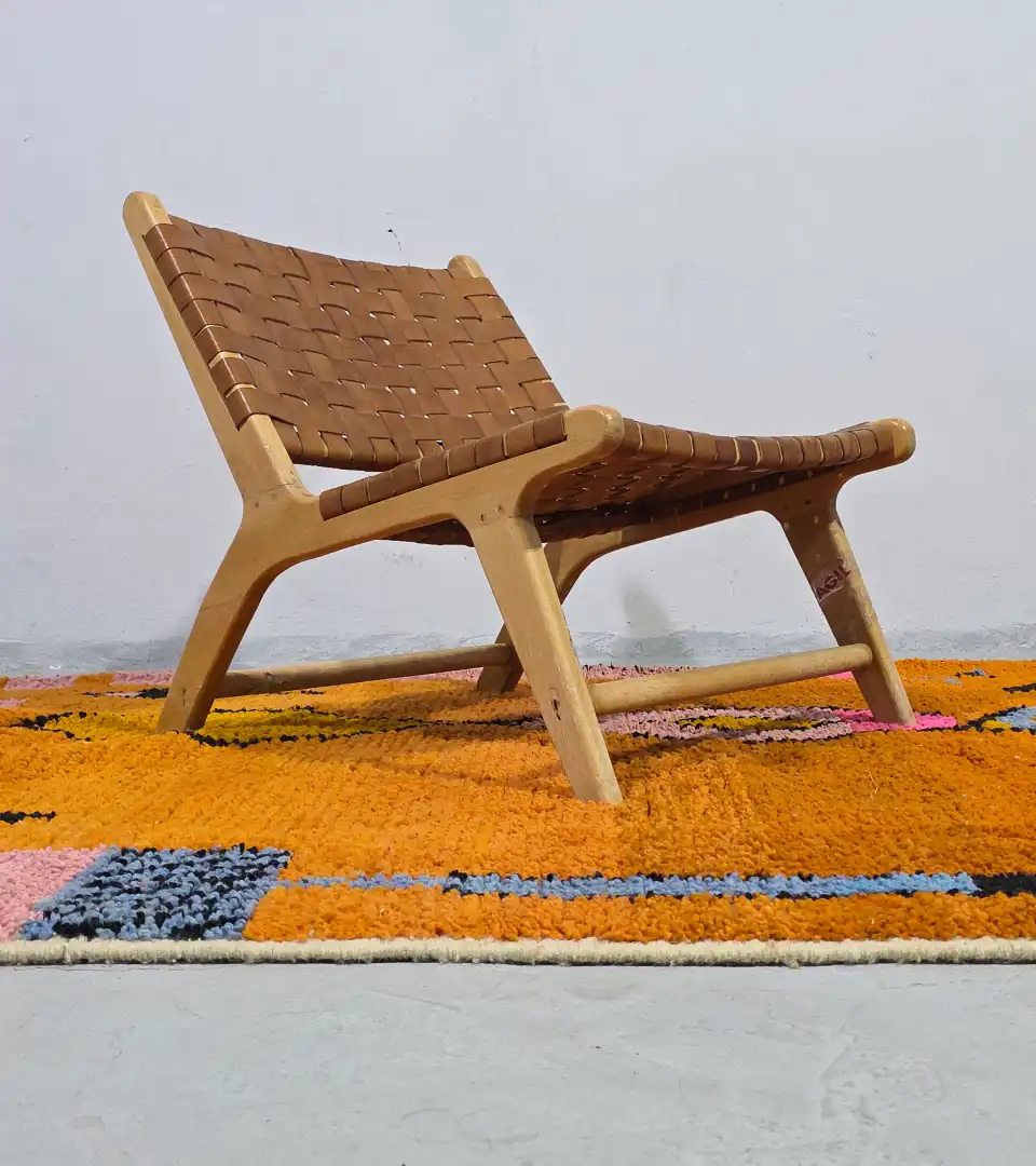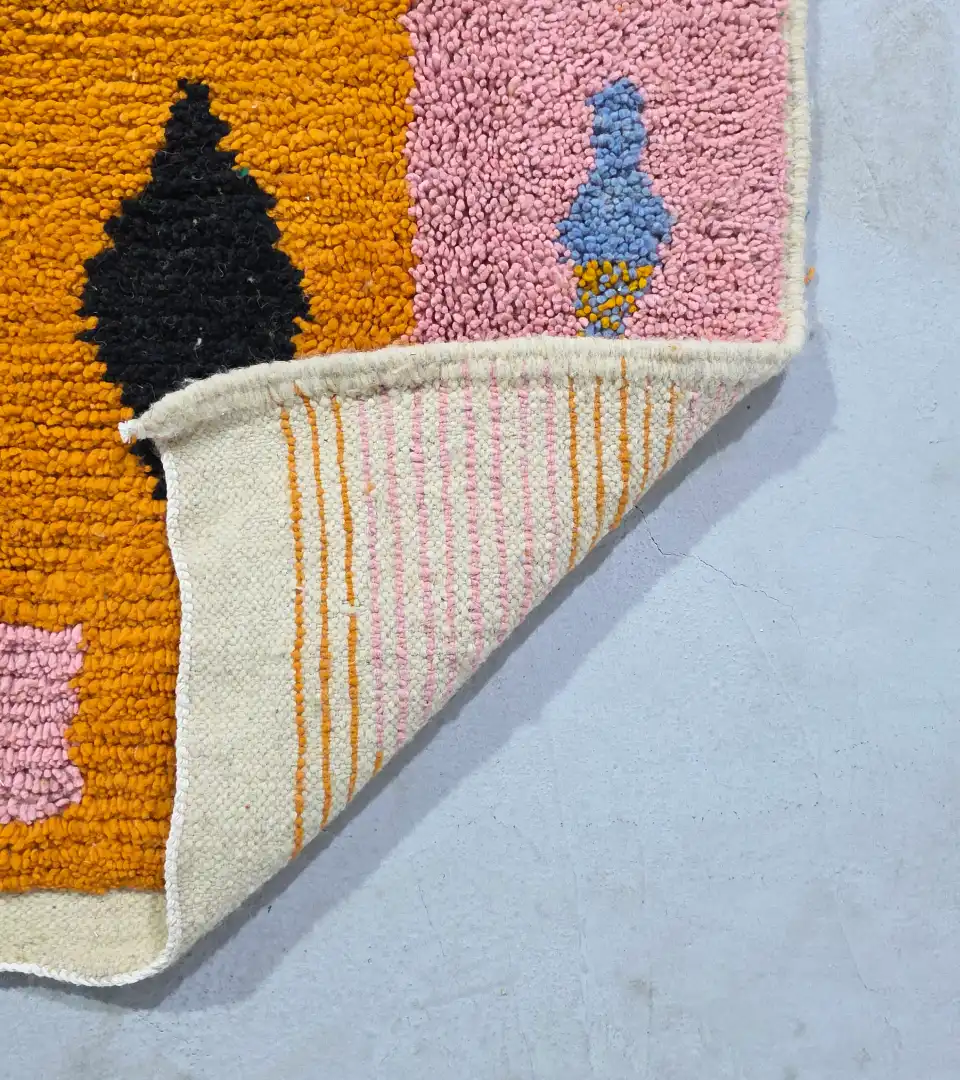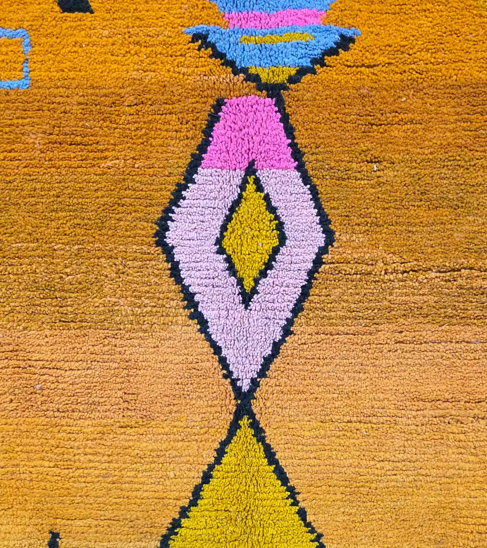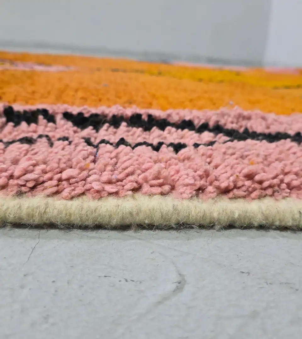 Crafted in Morocco using traditional hand knotting techniques, this 100% wool rug combines vibrant color with structured geometric design. Its warm orange base creates an inviting foundation while layered motifs introduce rhythm and visual contrast.