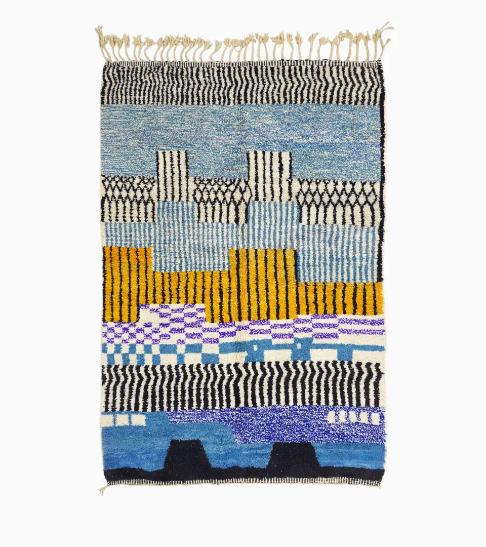 Embrace a vibrant, bohemian aesthetic with the Nareen, a hand-knotted Beni Mrirt rug. Hand-crafted in Morocco, this plush textured wool rug features a dynamic, abstract geometric design. It is a captivating composition of horizontal stripes and geometric blocks in various shades of blue, yellow, black, and white. The extra soft, high pile adds a layer of luxurious comfort and rich texture.