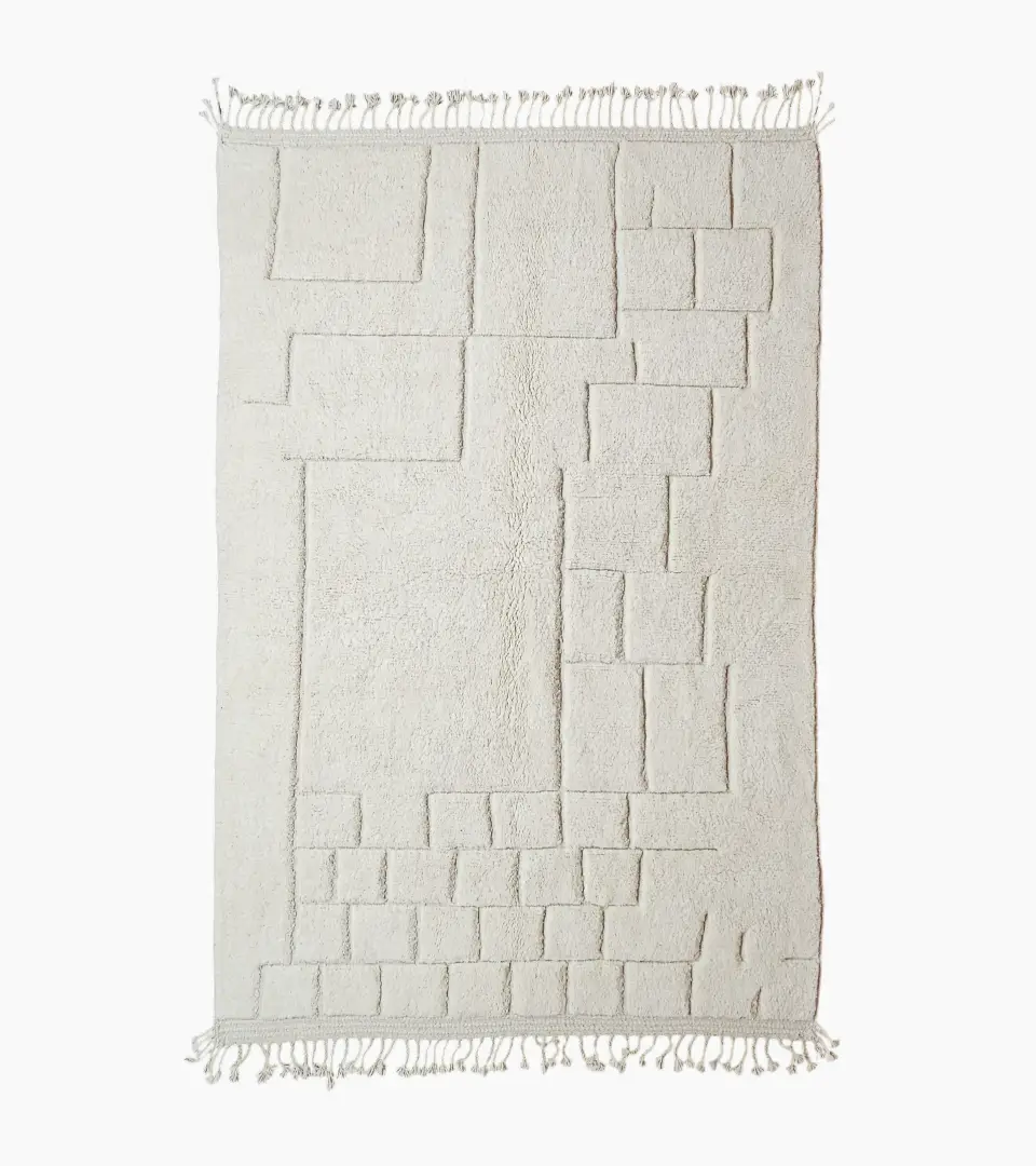 The Nora cream moroccan rug features a soft tone with an abstract arrangement of raised rectangular shapes, forming a modern geometric composition. Handwoven using natural wool, the variation in pile height creates a subtle 3D effect that adds depth while remaining minimal and versatile.