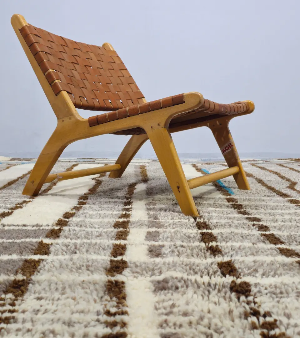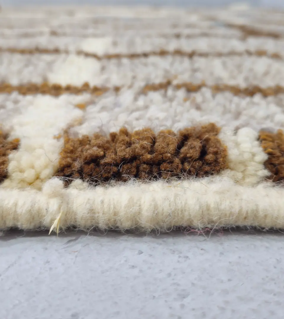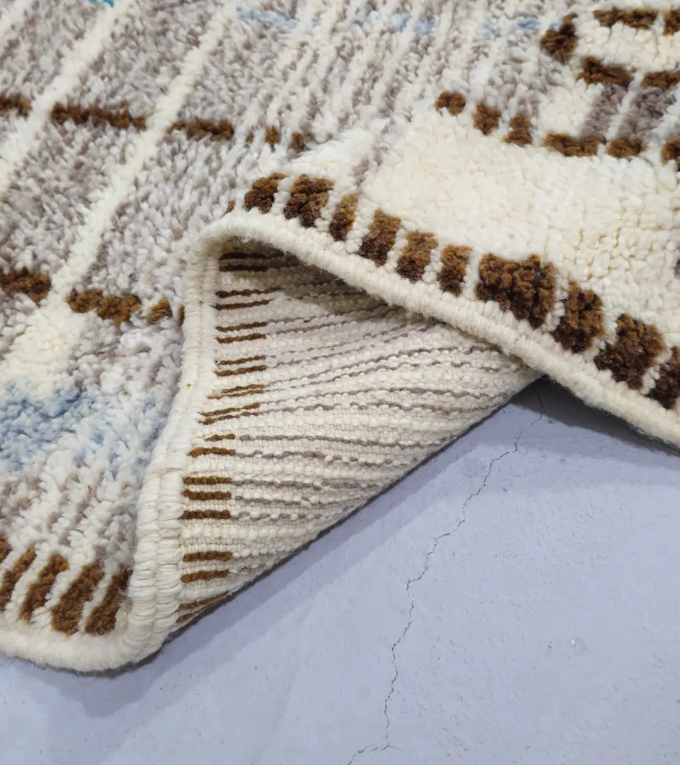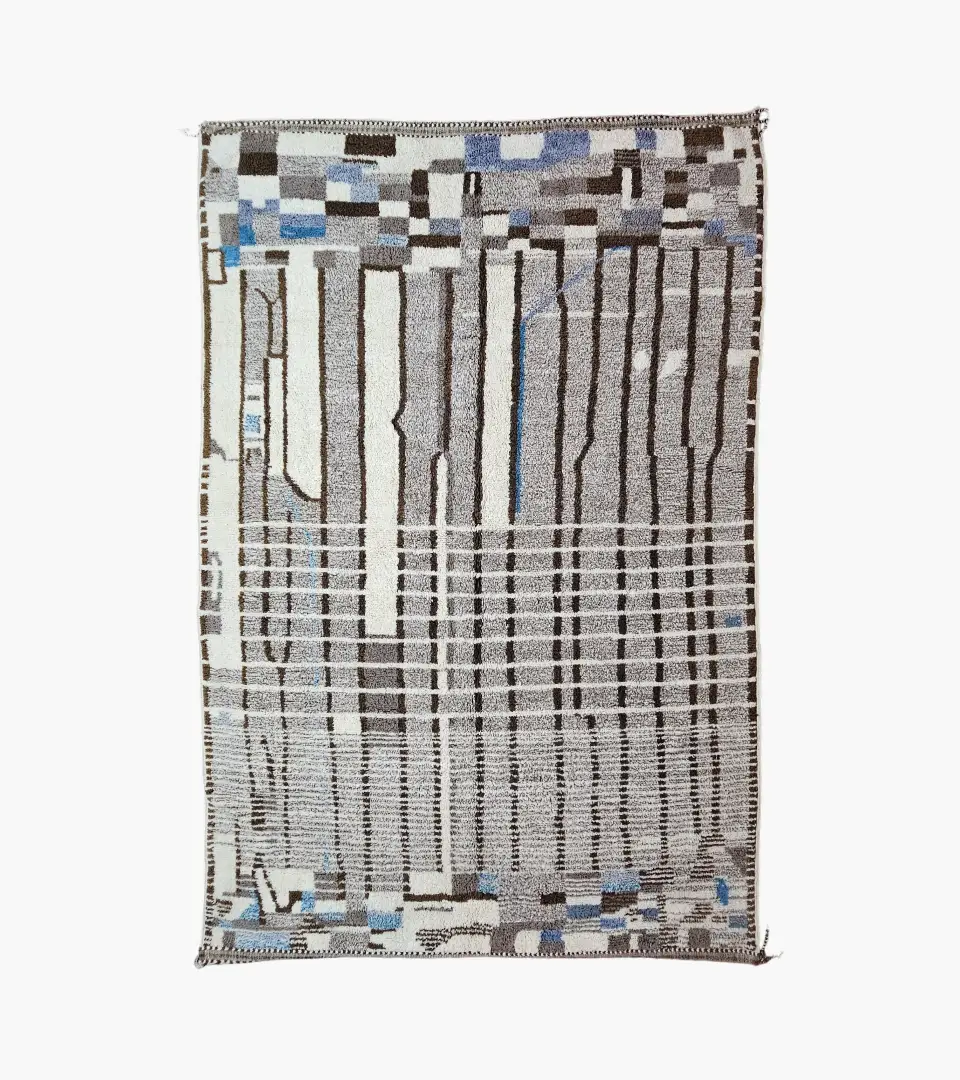 Introduce a sophisticated, modern aesthetic with the Orin, a hand-knotted Azilal indoor rug. Hand-crafted in Morocco, this plush Azilal wool rug features a striking abstract design with a combination of bold linear elements and geometric blocks. The color palette is predominantly composed of muted grays, warm browns, and creamy ivory, accented by deliberate touches of light blue. The high pile adds a layer of luxurious comfort and a ‘plush cloud’ feeling underfoot.