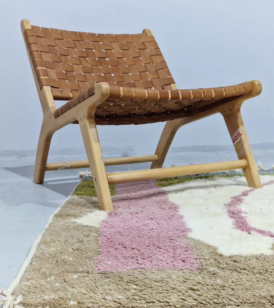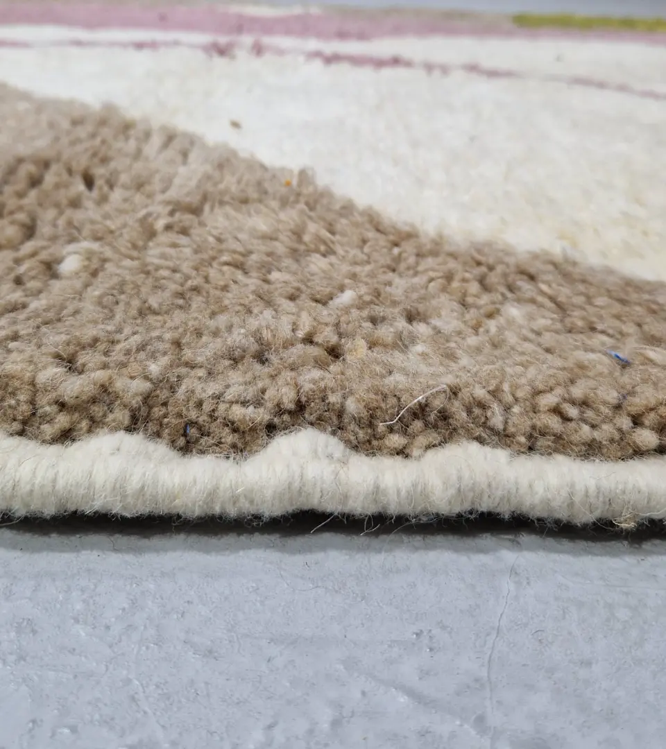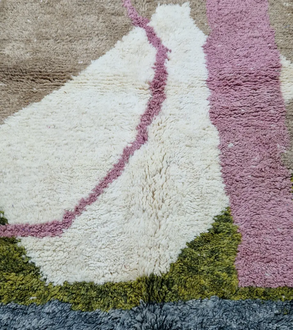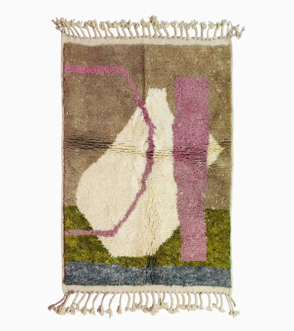 Embrace a sense of bohemian artistry with the Sary, a hand-knotted boho moroccan rug. Hand-crafted by skilled Berber artisans in the Atlas Mountains, this plush, high-pile rug features a captivating abstract design of organic shapes and painterly color blocks. Shades of earthy brown, muted olive green, and soft pink are beautifully arranged against a creamy ivory backdrop, creating a sophisticated yet relaxed feel. Its soft texture and durable construction make it a comfortable and stylish focal point.