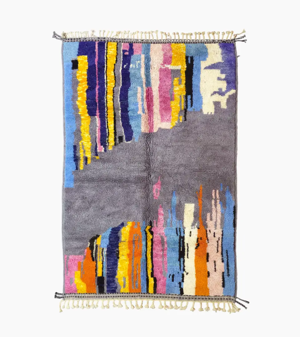 A true work of modern art for your floor, the Sola wool rug is a vibrant and imaginative centerpiece for any space. Hand-knotted from 100% pure wool, this rug features a stunning abstract design that resembles a cityscape or skyline, with a high-pile texture that adds dimension. Vertical stripes and blocks of color in a rich palette of blue, yellow, pink, white, orange, and black stand out against a neutral gray background. This unique piece is a handcrafted statement that can be made to order to fit your specific needs.
