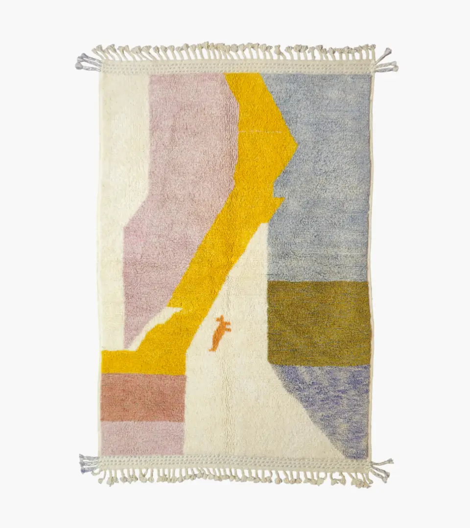 A true work of modern art for your floor, the Vera Modern Plush Tasseled rug is a soft and imaginative centerpiece for any space. Hand-knotted from 100% pure wool, this rug features a stunning abstract design with cloud-like, irregular shapes in a sophisticated palette of muted pink, vibrant yellow, gray, and natural off-white. The plush, high-pile texture is incredibly soft and adds a cozy, handcrafted quality to its eye-catching design. Finished with delicate tassels, this unique piece can be made to order to your custom size.